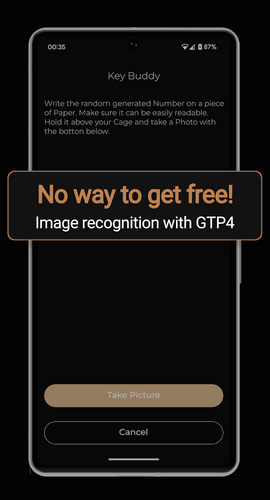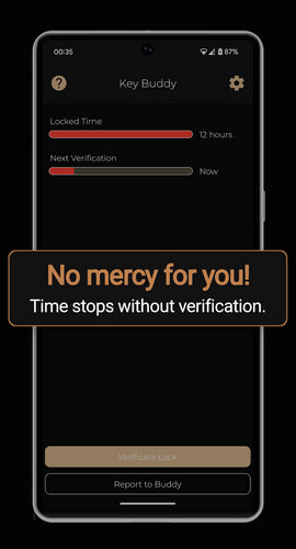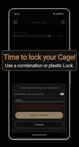 Take a Picture of your lock and set your locked time. Set a verification Time that will stop the clock if you don't verify that you are still properly locked. Expesialy designed with BDSM in mind.